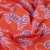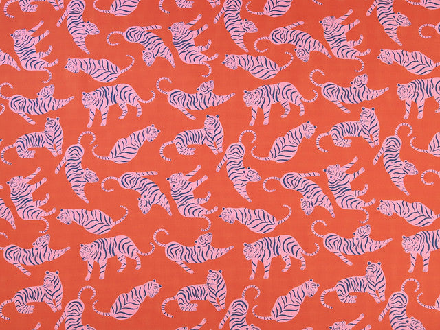 This dressmaking fabric has a bold pink Tiger printed on a bright orange background printed onto the most wonderful quality denim dressmaking fabric.