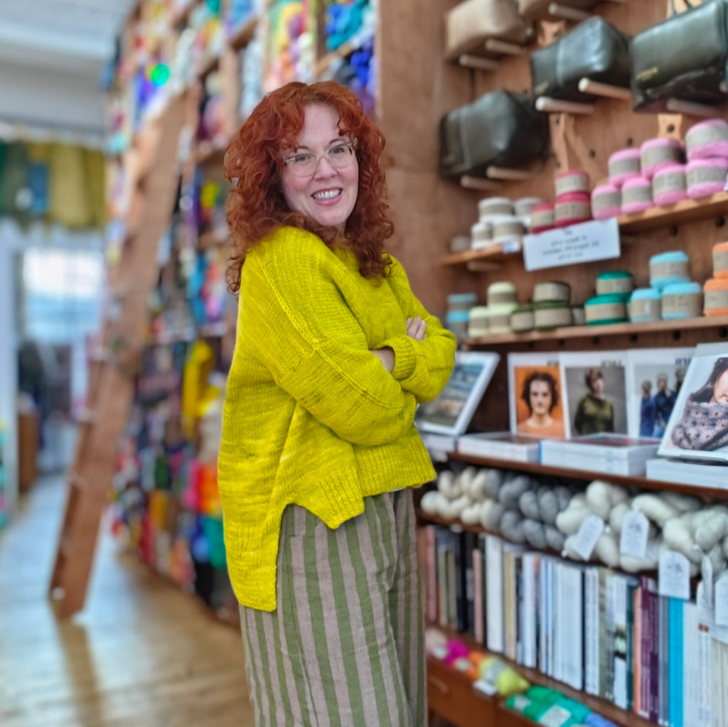 A basic round neck, long sleeve sweater knitted in stocking stitch with rib details. The sleeves are worked in reverse stocking stitch with a raised knit stitch in the centre. The front hem is shaped and is shorter than the back hem. The pieces are worked flat, seamed and stitches be are then picked up for the neckline.
