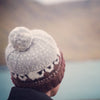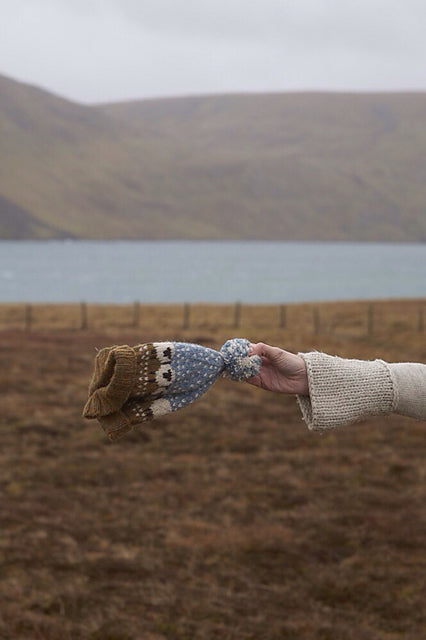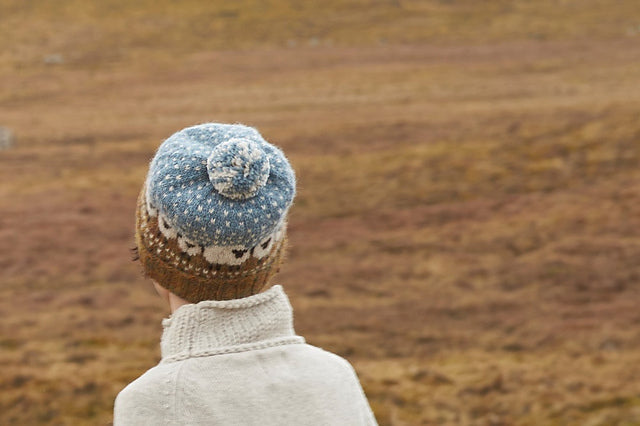 It is knitted in Shetland Aran weight yarn at a fairly tight gauge making a warm and cosy hat, good for keeping your ears warm in the Shetland wind!