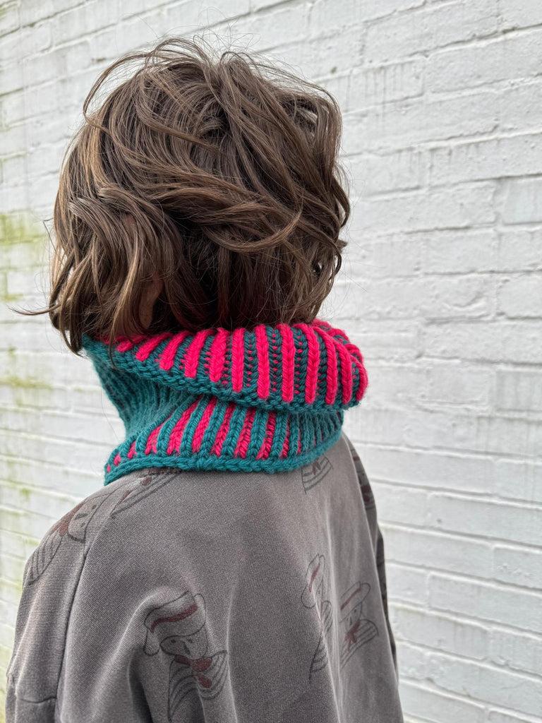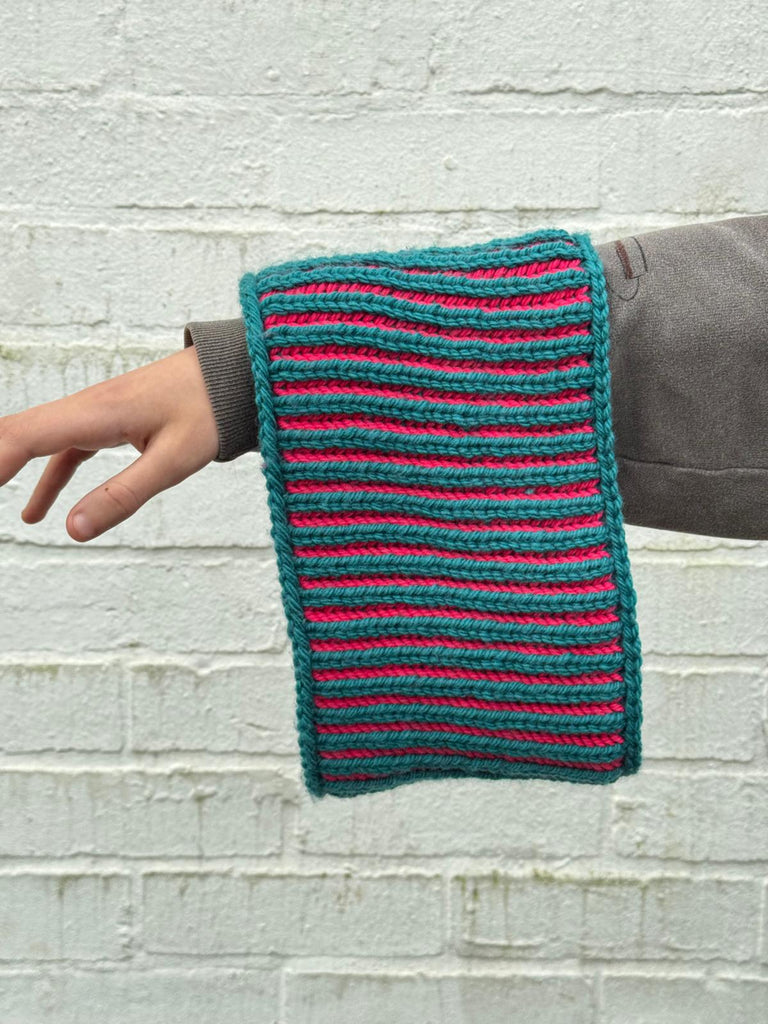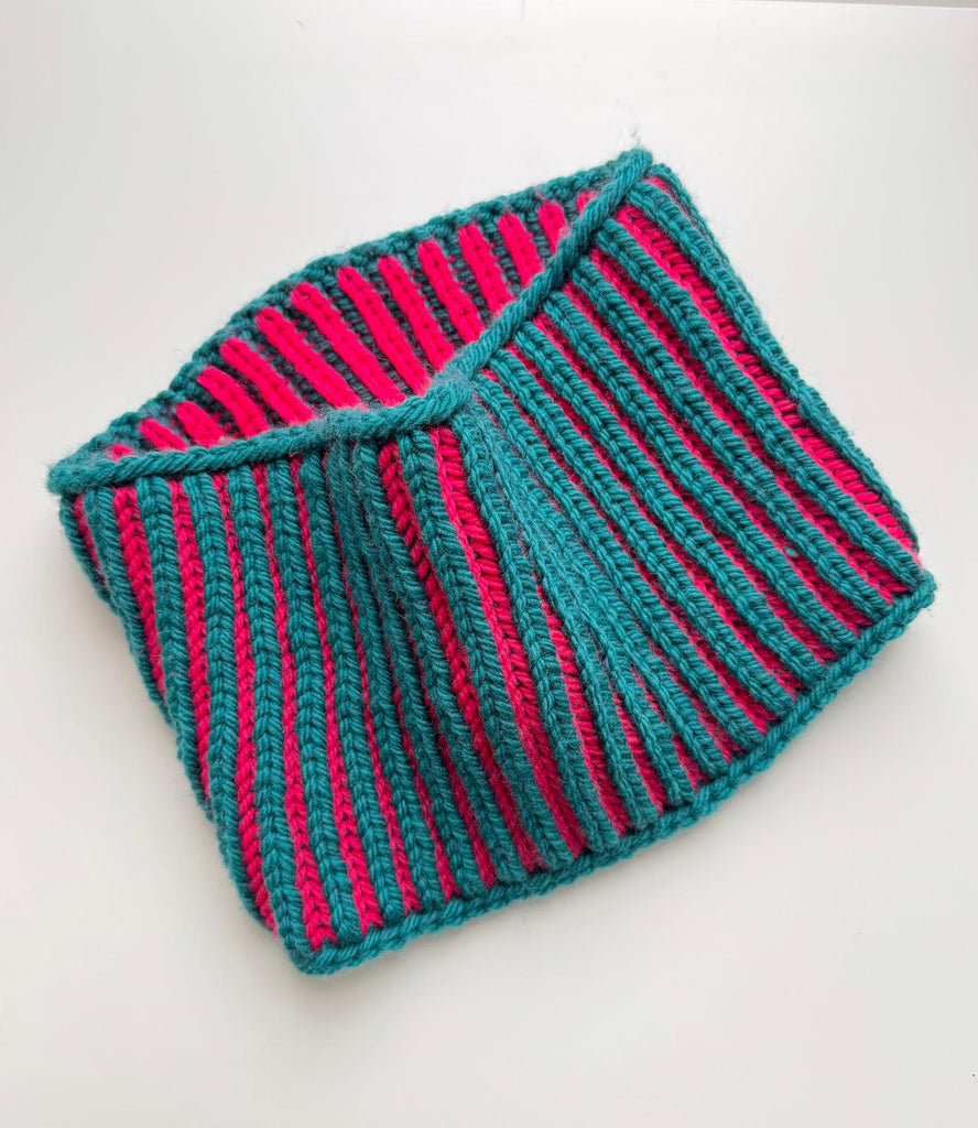 In this workshop you will learn the basics of brioche knitting working in the round on a neck warmer.This cowl is the perfect first brioche knitting project, surprisingly simple and fun once you get going. The brioche stitch is stretchy and squishy and will keep you cosy and stylish.